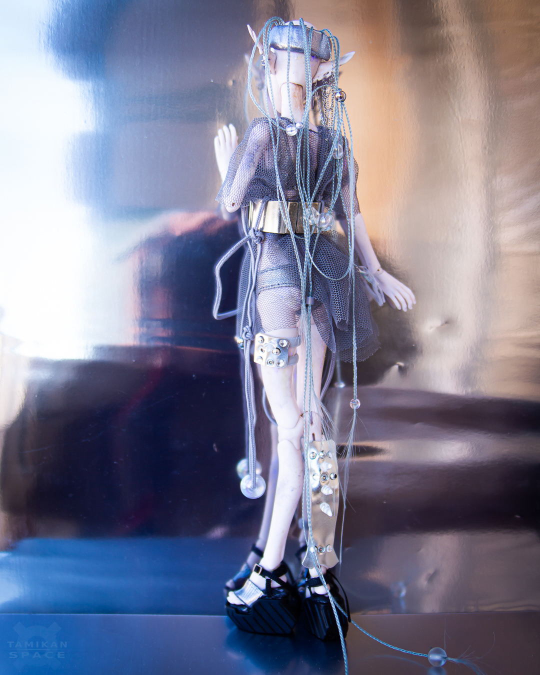This doll is a Sprout Gal doll with a Stanced torso in Arctic tint with Opalescent treatment featuring a Dummy mould faceplate and cyborg headback.