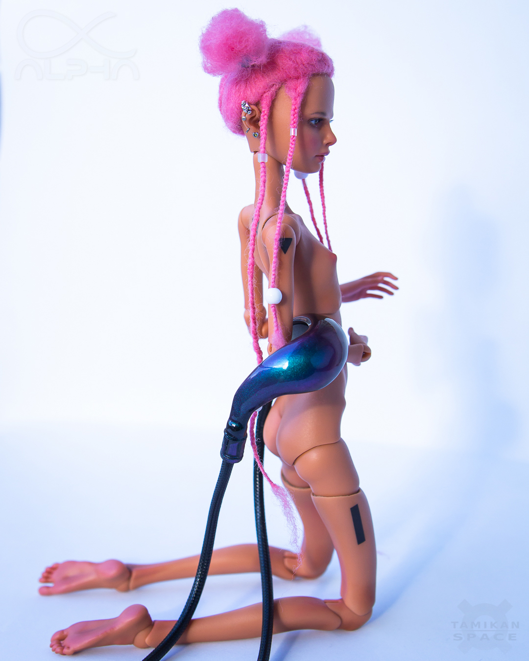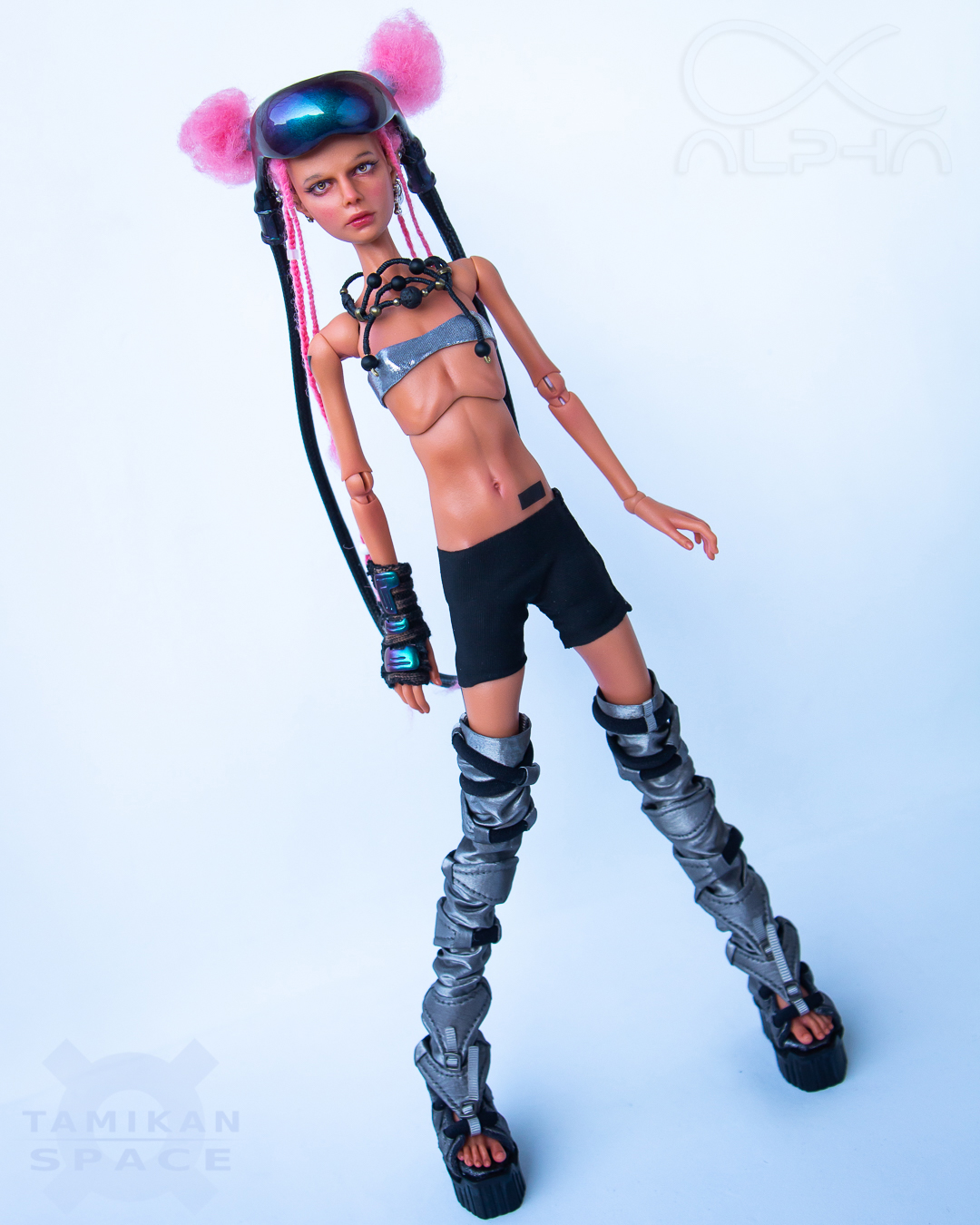 Alpha is a 31 cm (12.2") ball-jointed doll cast of polyurethane resin, her eye sockets fit 6 mm diameter eyes. Her head fits 4" wigs and her flat feet are 4 cm (1.6") long. The girl's hands are held by magnets so it's easy to remove them to change clothes. She's got two pairs of feet, flat and tip-toed for high-heeled shoes; they are held by magnets as well.