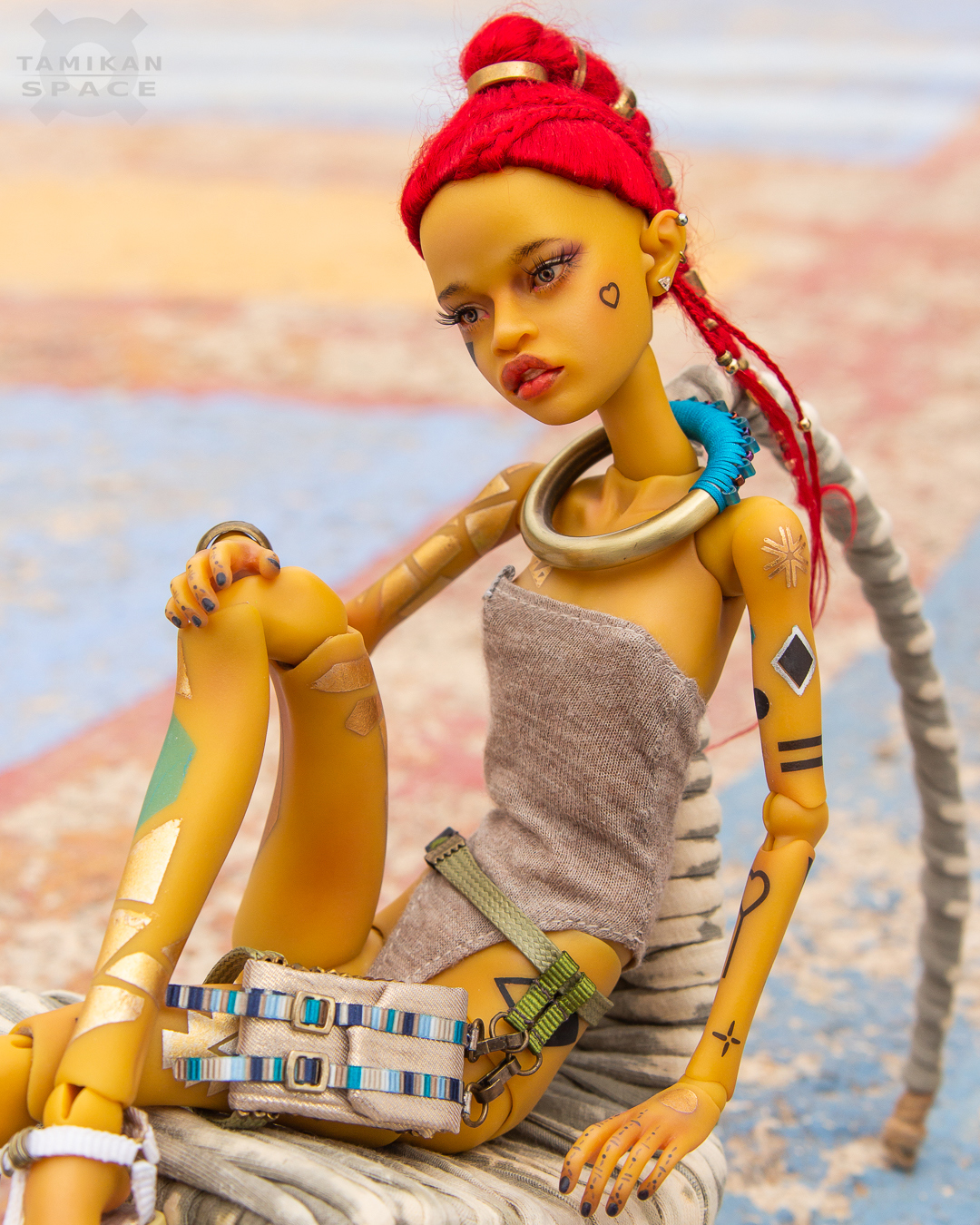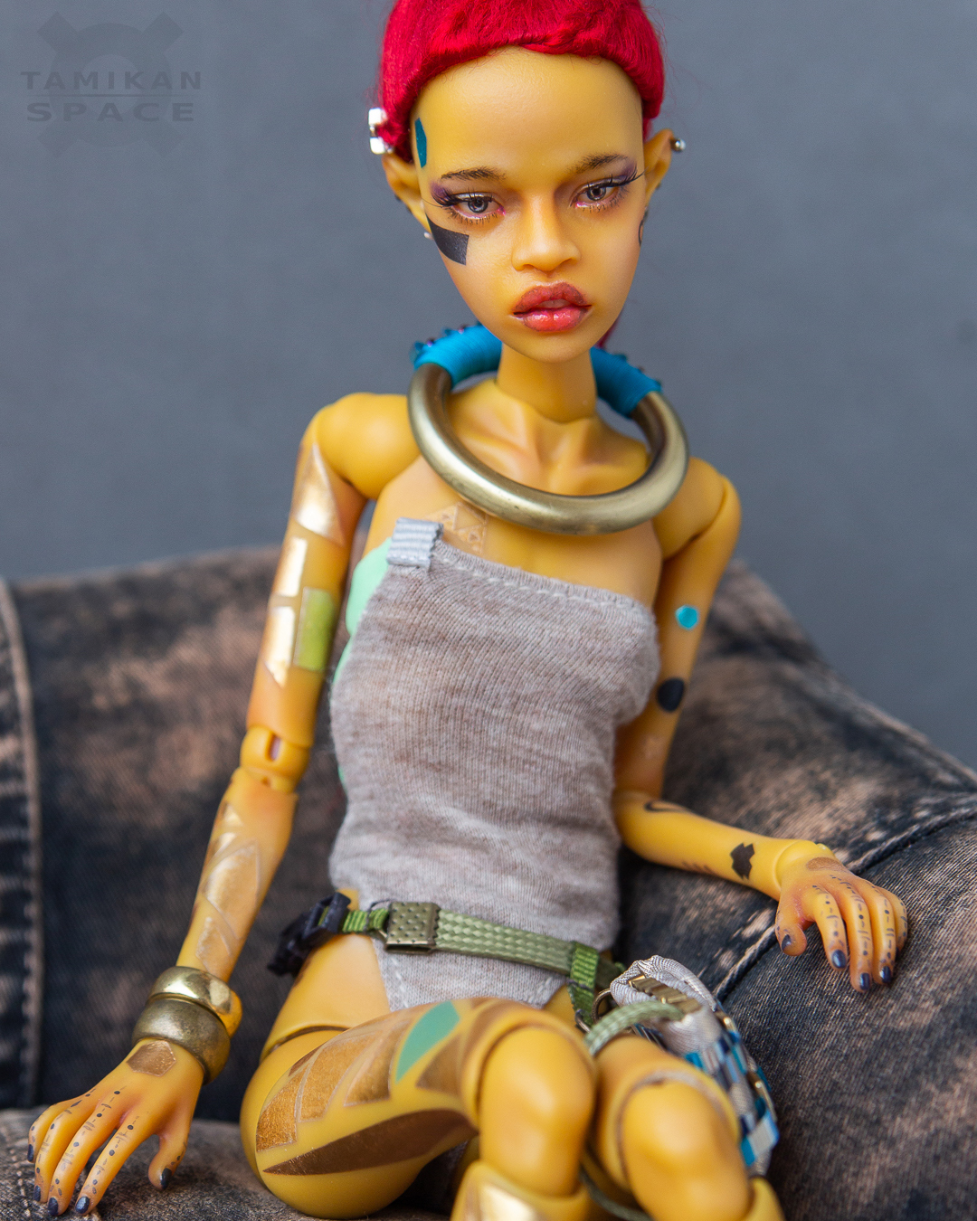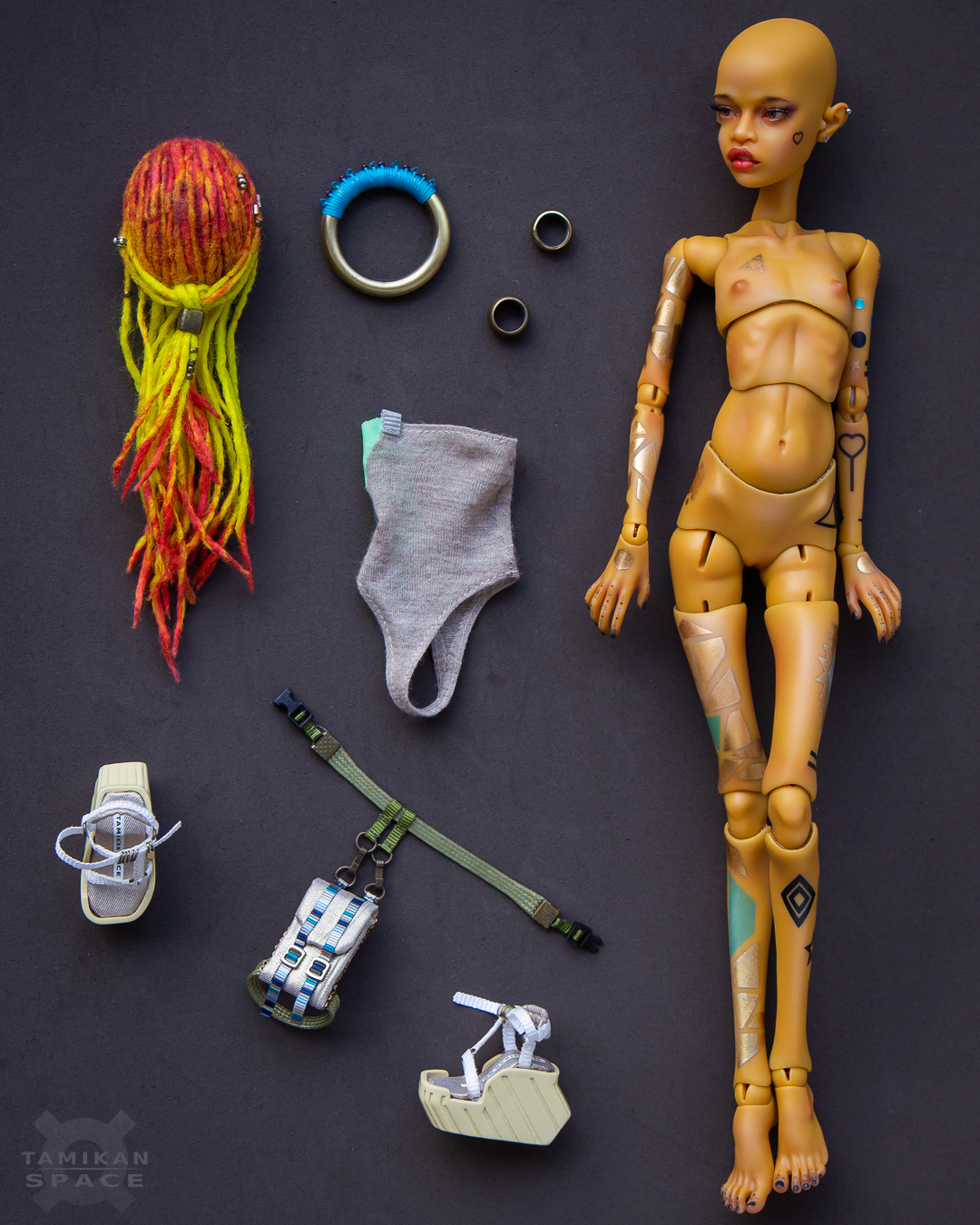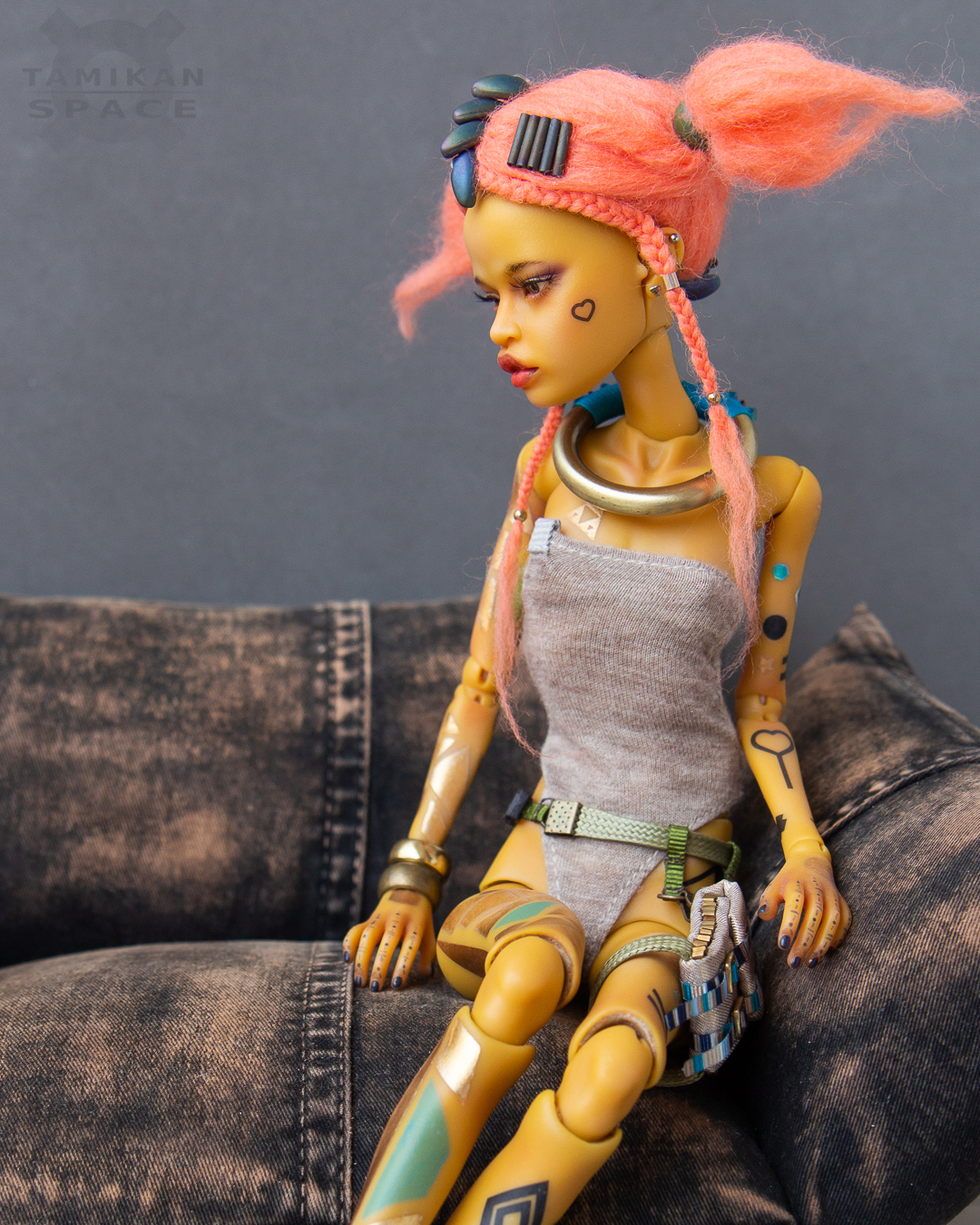 Ember is one of a kind full set Sprout Gal doll in Mangrove tint featuring Curious faceplace of Kioni mould.