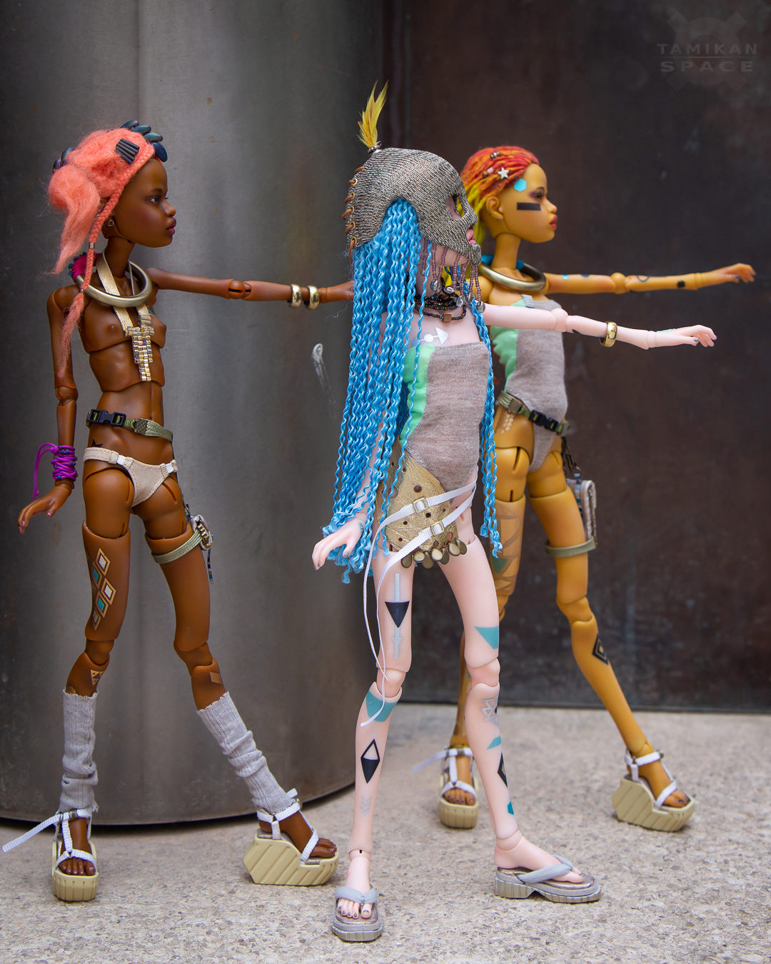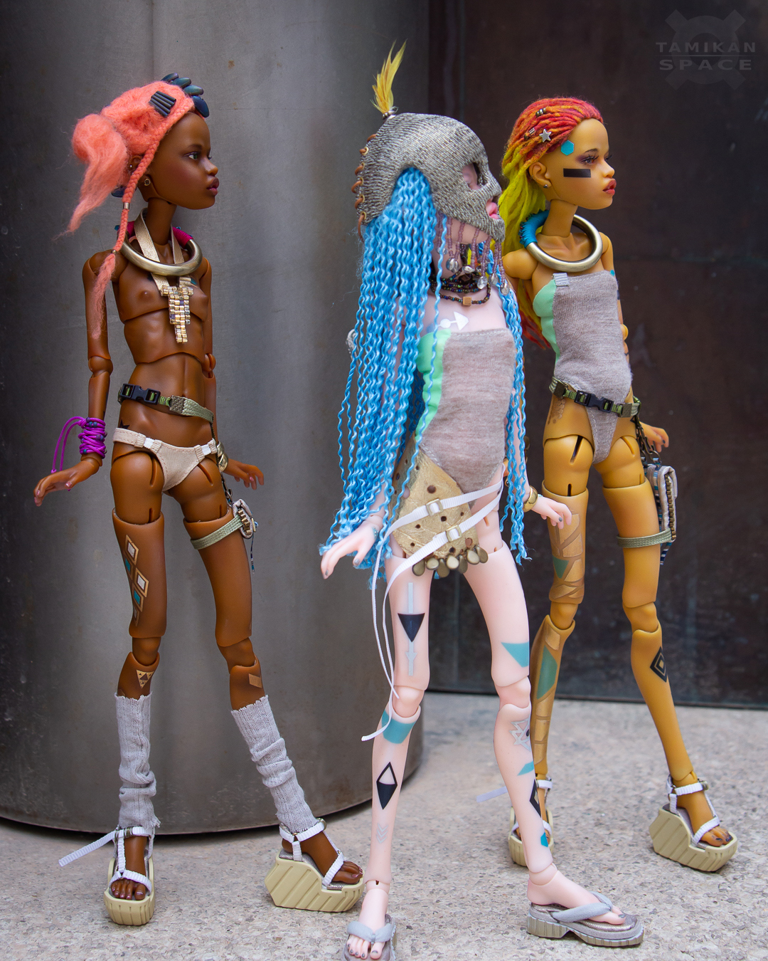 Kioni is a 31 cm (12.2") ball-jointed doll cast of polyurethane resin, her eye sockets fit 6 mm diameter eyes. Her head fits 4" wigs and her feet are 4 cm (1.6") long. The girl's hands are held by magnets so it's easy to remove them to change clothes.