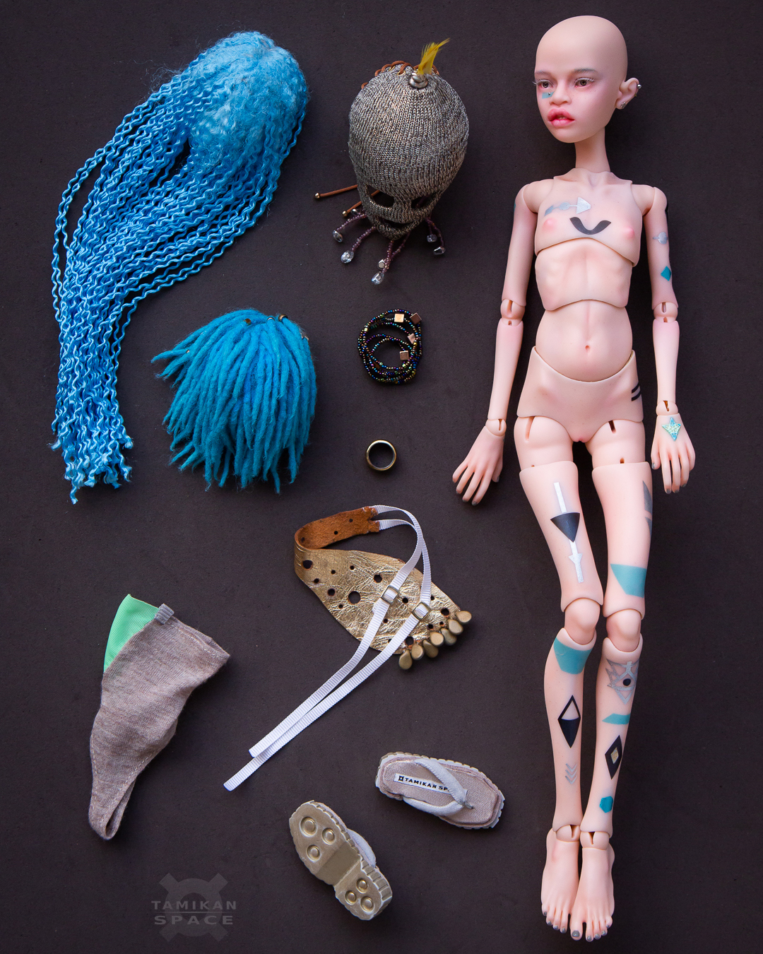 Kioni is a 31 cm (12.2") ball-jointed doll cast of polyurethane resin, her eye sockets fit 6 mm diameter eyes. Her head fits 4" wigs and her feet are 4 cm (1.6") long. The girl's hands are held by magnets so it's easy to remove them to change clothes.