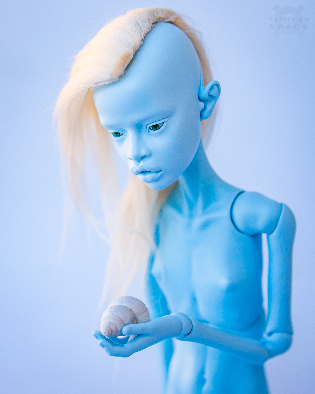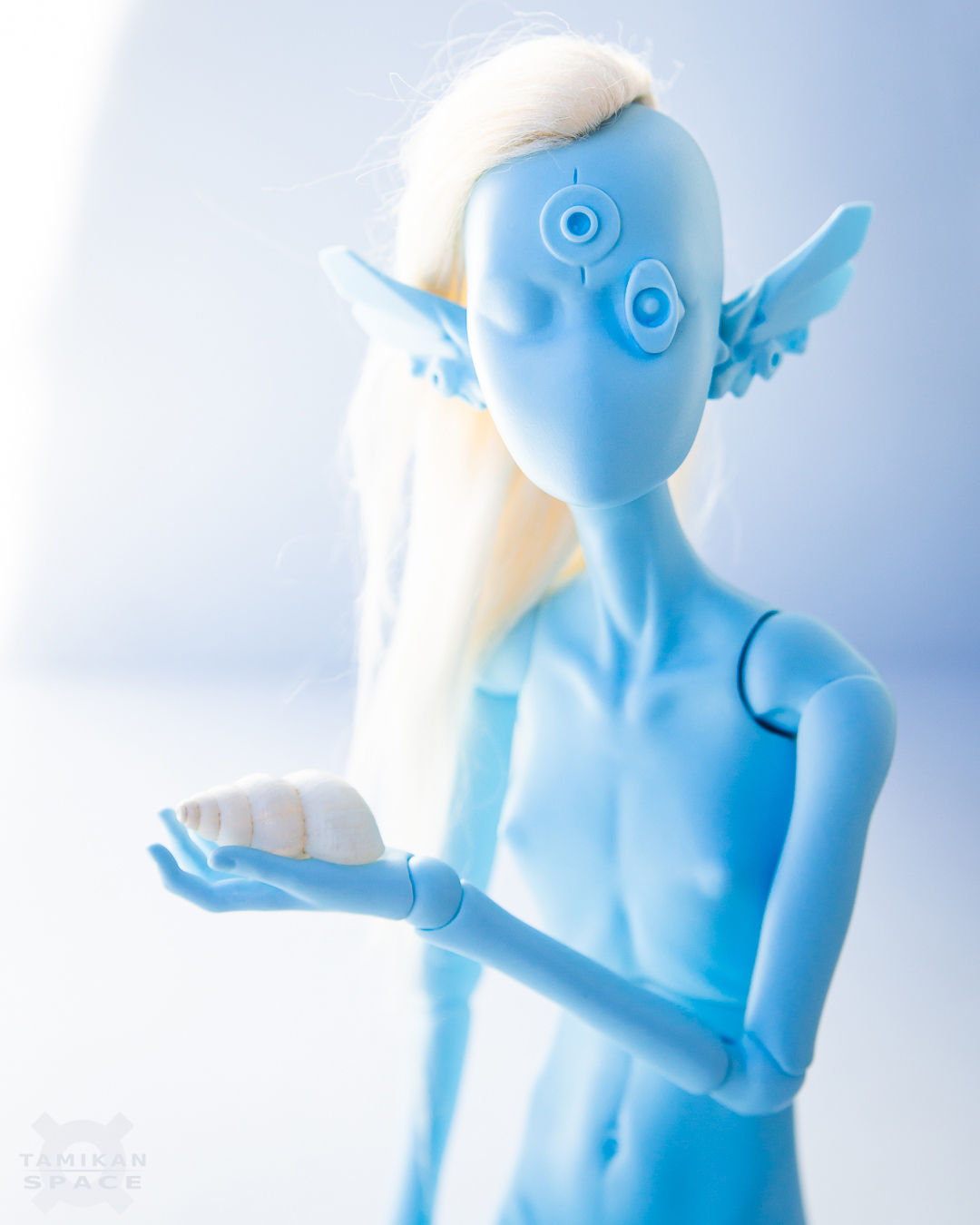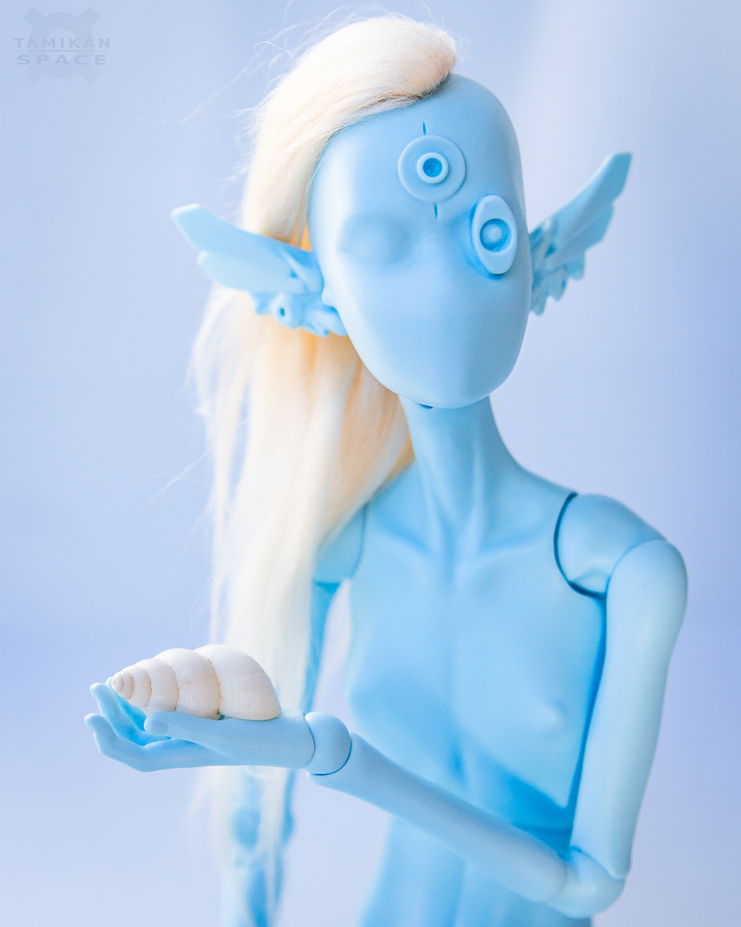 This doll is a blank Sprout Gal doll with a Stanced torso in Ygam tint featuring a Curious faceplace of Kioni mould and a Dummy faceplate with both human and cyborg headbacks.