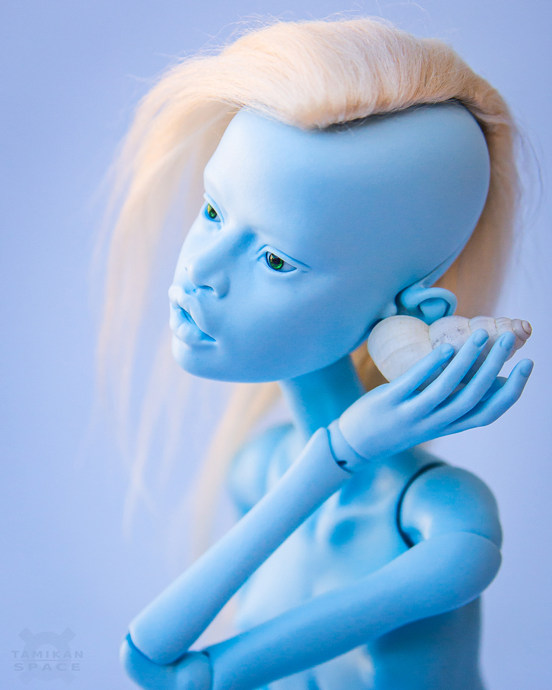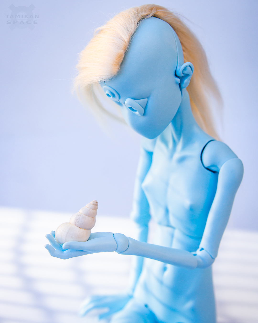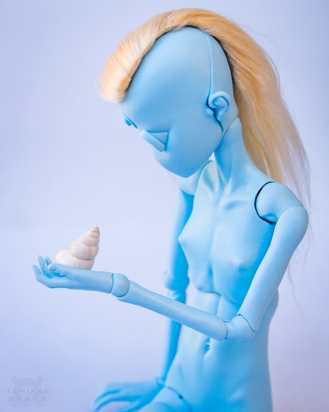 This Gal is a 31 cm (12.2") ball-jointed doll cast of polyurethane resin, her eye sockets fit 6 mm diameter eyes. Her head fits 4" wigs and her flat feet are 4 cm (1.6") long. The girl's hands are held by magnets so it's easy to remove them to change clothes. She's got two pairs of feet, flat and tip-toed for high-heeled shoes; they are held by magnets as well.