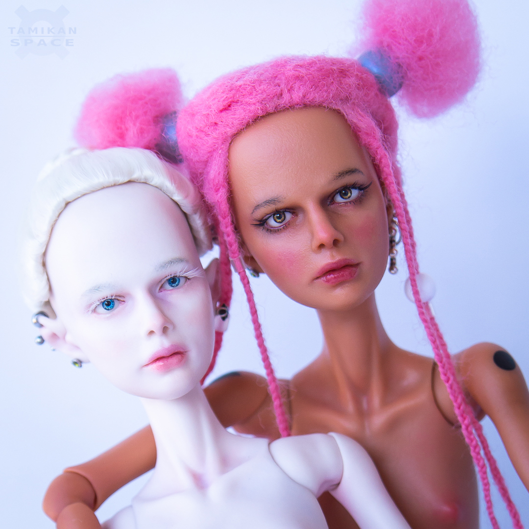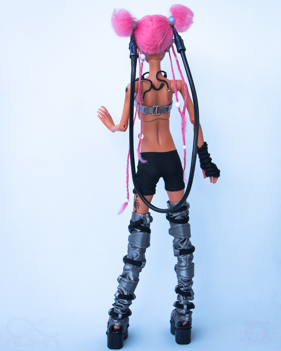 Alpha is a 31 cm (12.2") ball-jointed doll cast of polyurethane resin, her eye sockets fit 6 mm diameter eyes. Her head fits 4" wigs and her flat feet are 4 cm (1.6") long. The girl's hands are held by magnets so it's easy to remove them to change clothes. She's got two pairs of feet, flat and tip-toed for high-heeled shoes; they are held by magnets as well.