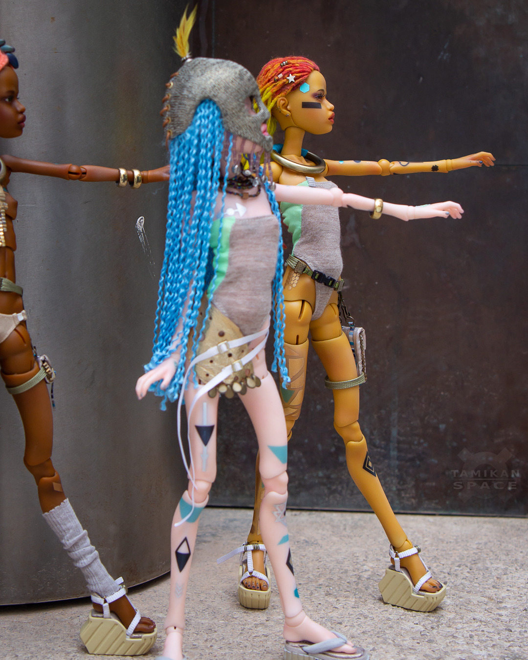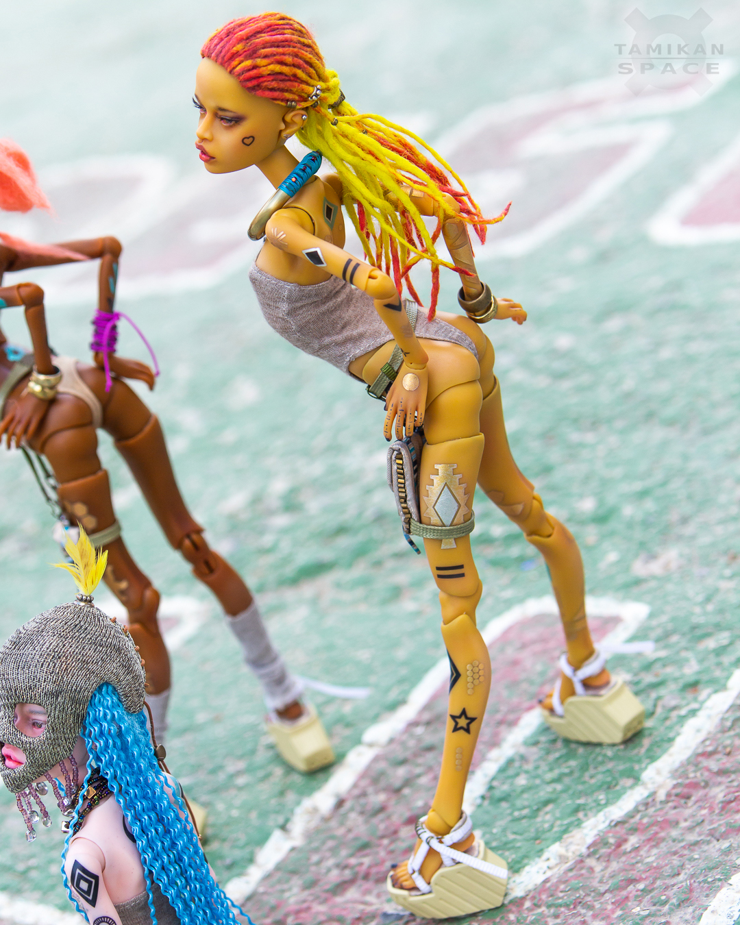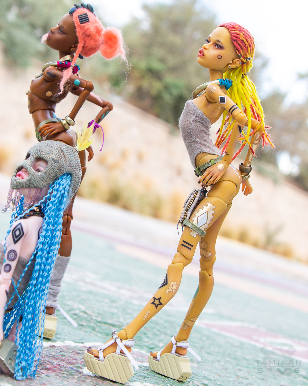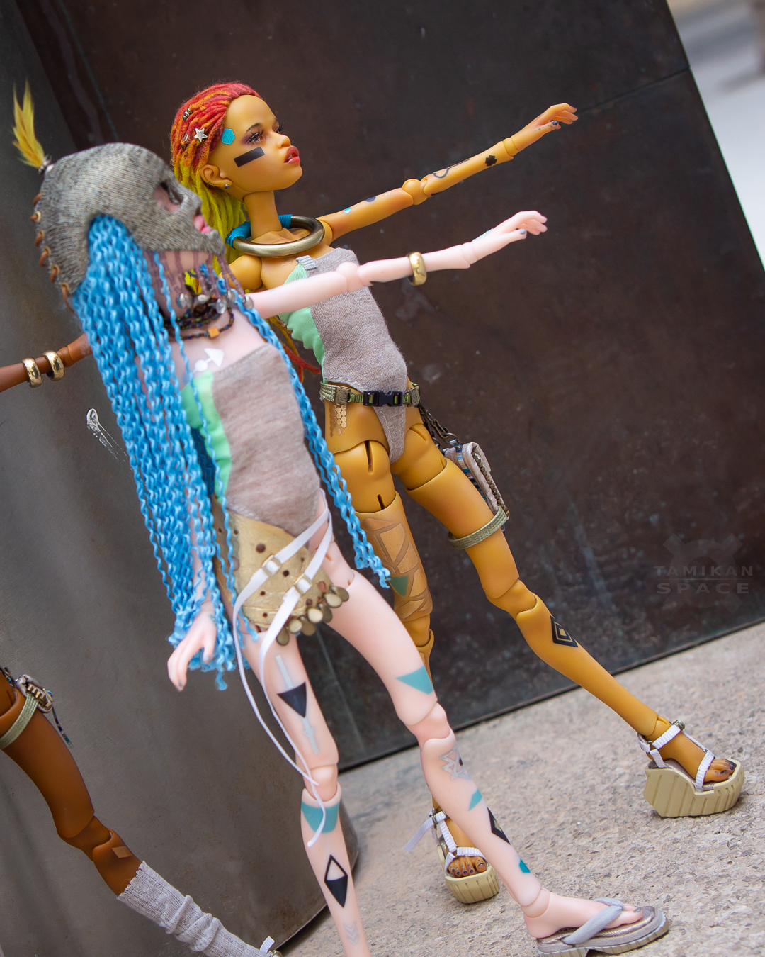 Kioni is a 31 cm (12.2") ball-jointed doll cast of polyurethane resin, her eye sockets fit 6 mm diameter eyes. Her head fits 4" wigs and her flat feet are 4 cm (1.6") long. The girl's hands are held by magnets so it's easy to remove them to change clothes. She's got two pairs of feet, flat and tip-toed for high-heeled shoes; they are held by magnets as well.