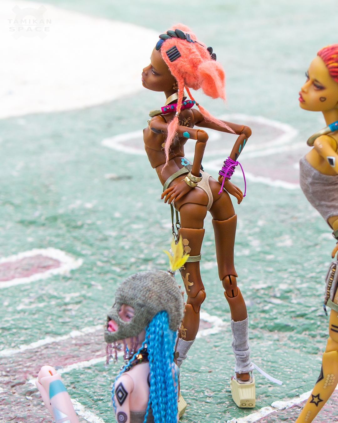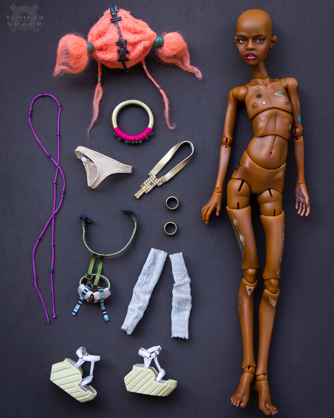 Kioni is a 31 cm (12.2") ball-jointed doll cast of polyurethane resin, her eye sockets fit 6 mm diameter eyes. Her head fits 4" wigs and her feet are 4 cm (1.6") long. The girl's hands are held by magnets so it's easy to remove them to change clothes.