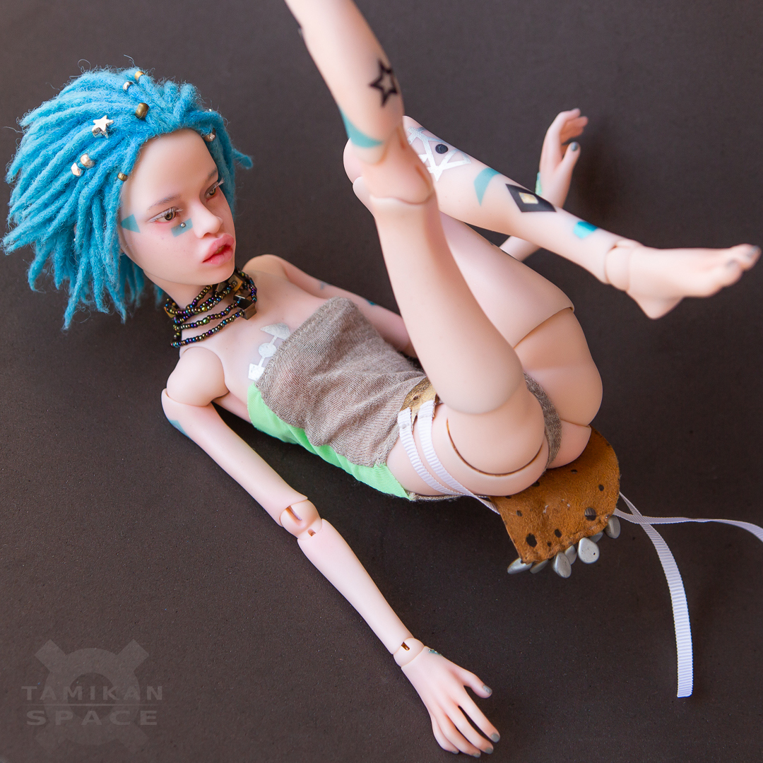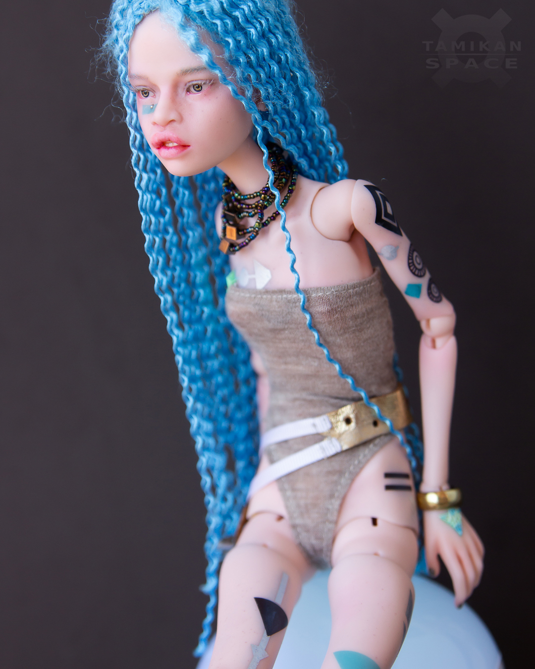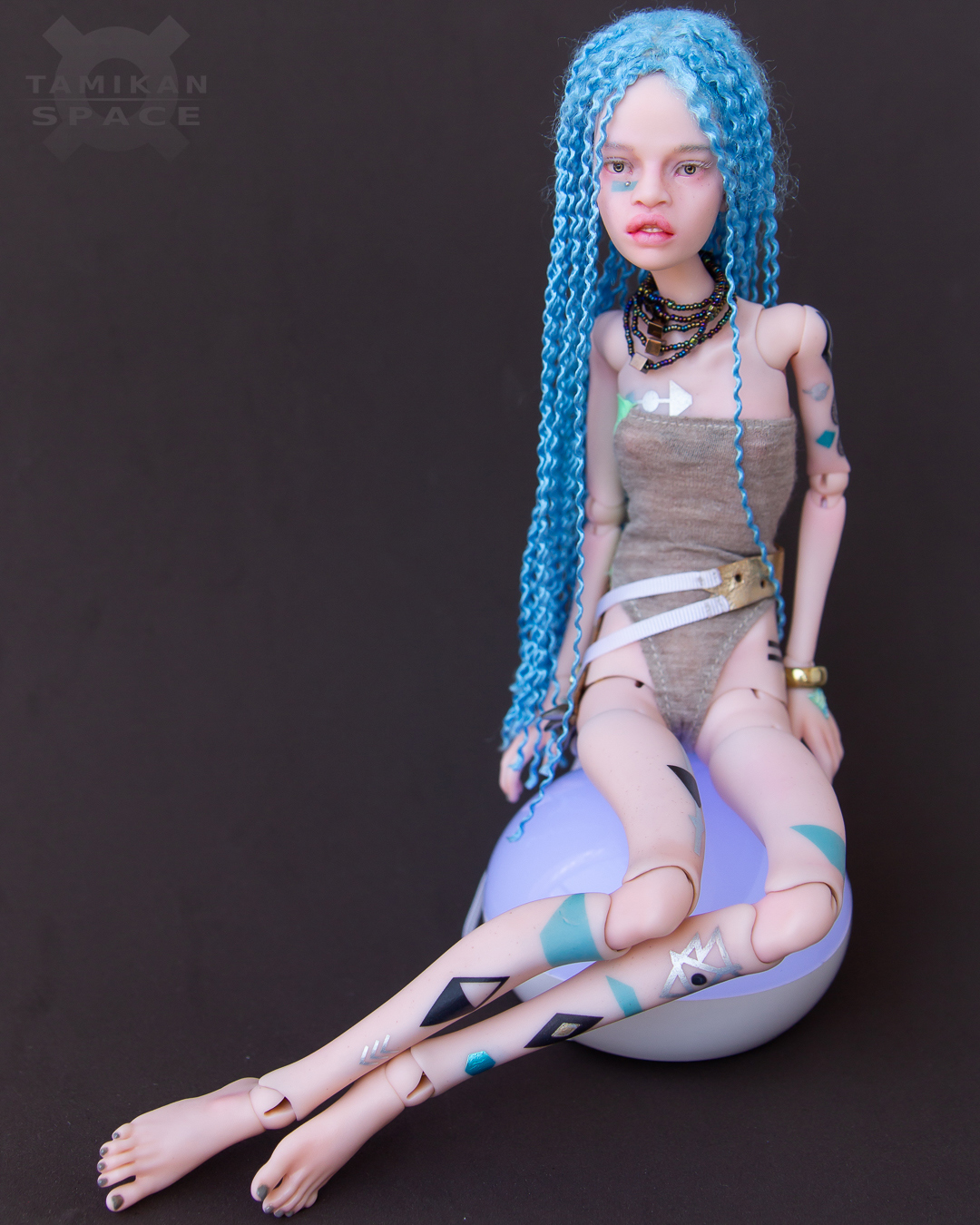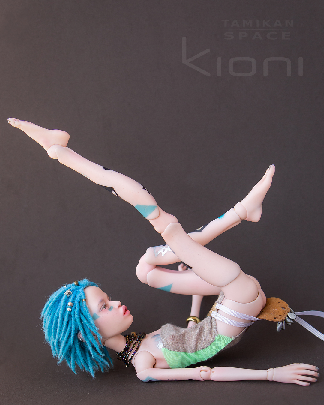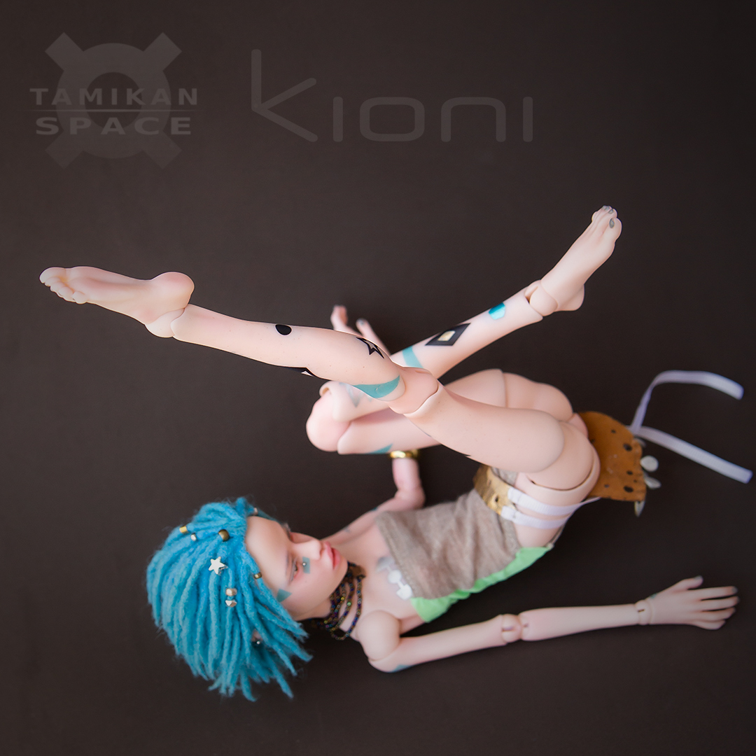 Kioni is a 31 cm (12.2") ball-jointed doll cast of polyurethane resin, her eye sockets fit 6 mm diameter eyes. Her head fits 4" wigs and her feet are 4 cm (1.6") long. The girl's hands are held by magnets so it's easy to remove them to change clothes.