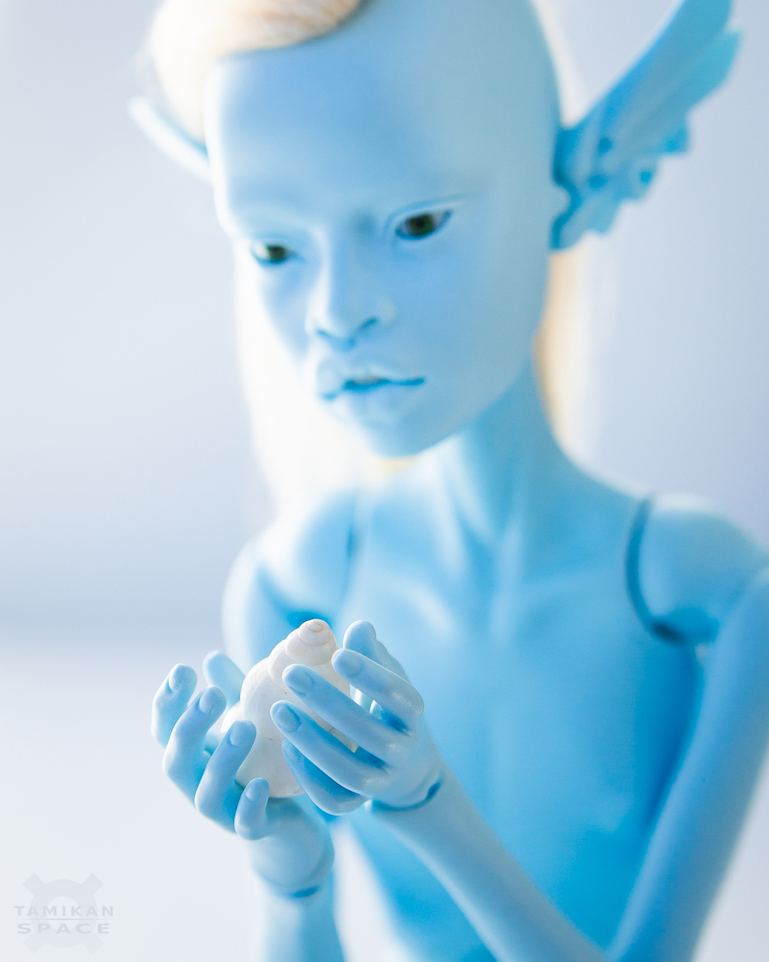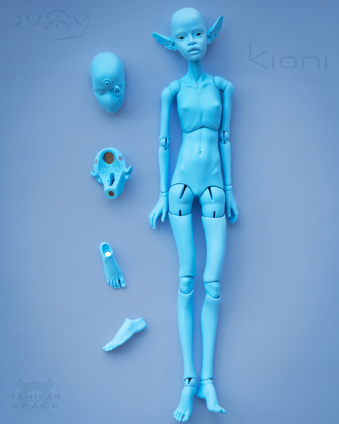 This doll is a blank Sprout Gal doll with a Stanced torso in Ygam tint featuring a Curious faceplace of Kioni mould and a Dummy faceplate with both human and cyborg headbacks.